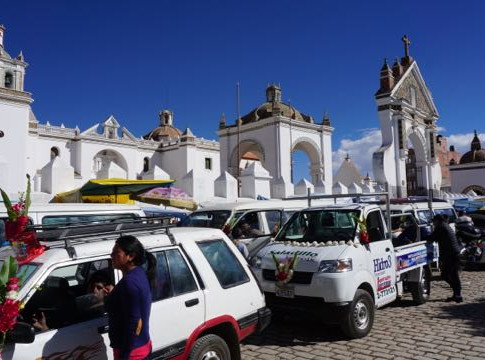 In het centrum van Copacabana staat een grote kerk, waar auto's, bussen en vrachtwagens ritueel gezegend (cha'lla) worden voor een veilige rit. De auto's worden versierd met (nep)bloemen, linten en hoedjes, en overgoten met alcohol (wat blijkbaar ook in de mond van de bestuurder verdwijnt). Blijkbaar wordt zo heilig in dit ritueel geloofd, dat de bestuurders zich onschendbaar voelen, want het verkeer is hier behoorlijk chaotisch. Met name in en rondom de steden. Maar als je het systeem kent, is het best logisch en doe je gewoon mee aan het rechts en links inhalen, invoegen, midden op de weg stilstaan, toeteren zonder reden, inhalen voor de bocht en zonder zicht op tegenliggers (oke, dat laatste doen we niet). De auto's zijn heuse attracties: vol stickers, verlaagd (wat superhandig is met alle mega-hoge drempels hier) en vol kerstverlichting, wat dan weer enigszins compenseert voor het niet functioneren van de voor/achter/remlichten.